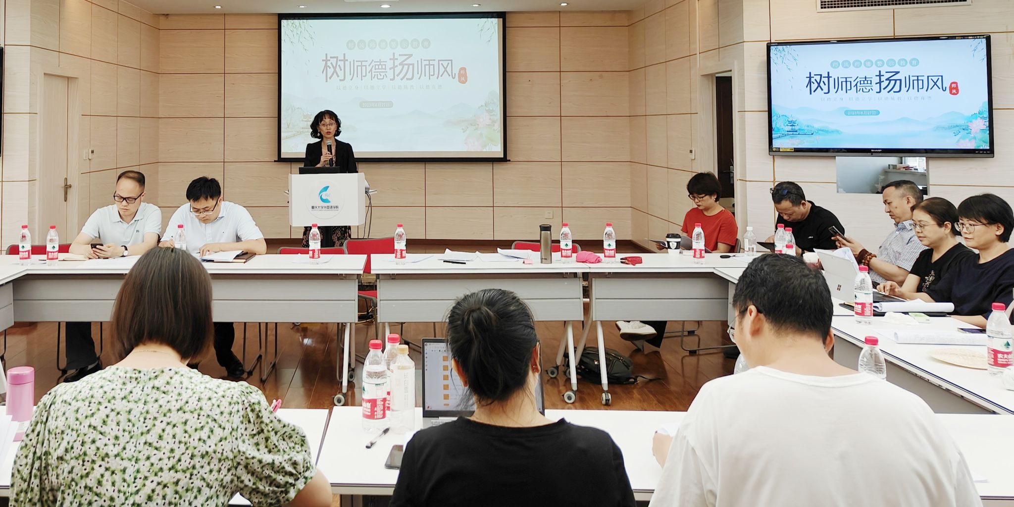 首先,欧玲以“树师德 扬师风”为题,从新时代下的师德师风,违反师德师风的具体表现,违反师德师风的典型案例,以及做“四有”好老师、当育人大先生四个方面给与会人员上了一堂生动的师德师风警示教育课,强调“国无德不兴,人无德不立”,要求与会人员充分认识师德师风建设的重要性,带头遵守《新时代高校教师职业行为十项准则》,绝不触碰高校教师师德“红七条”,以“四有”好老师的标准要求自己,做学生的“四个引路人”。
