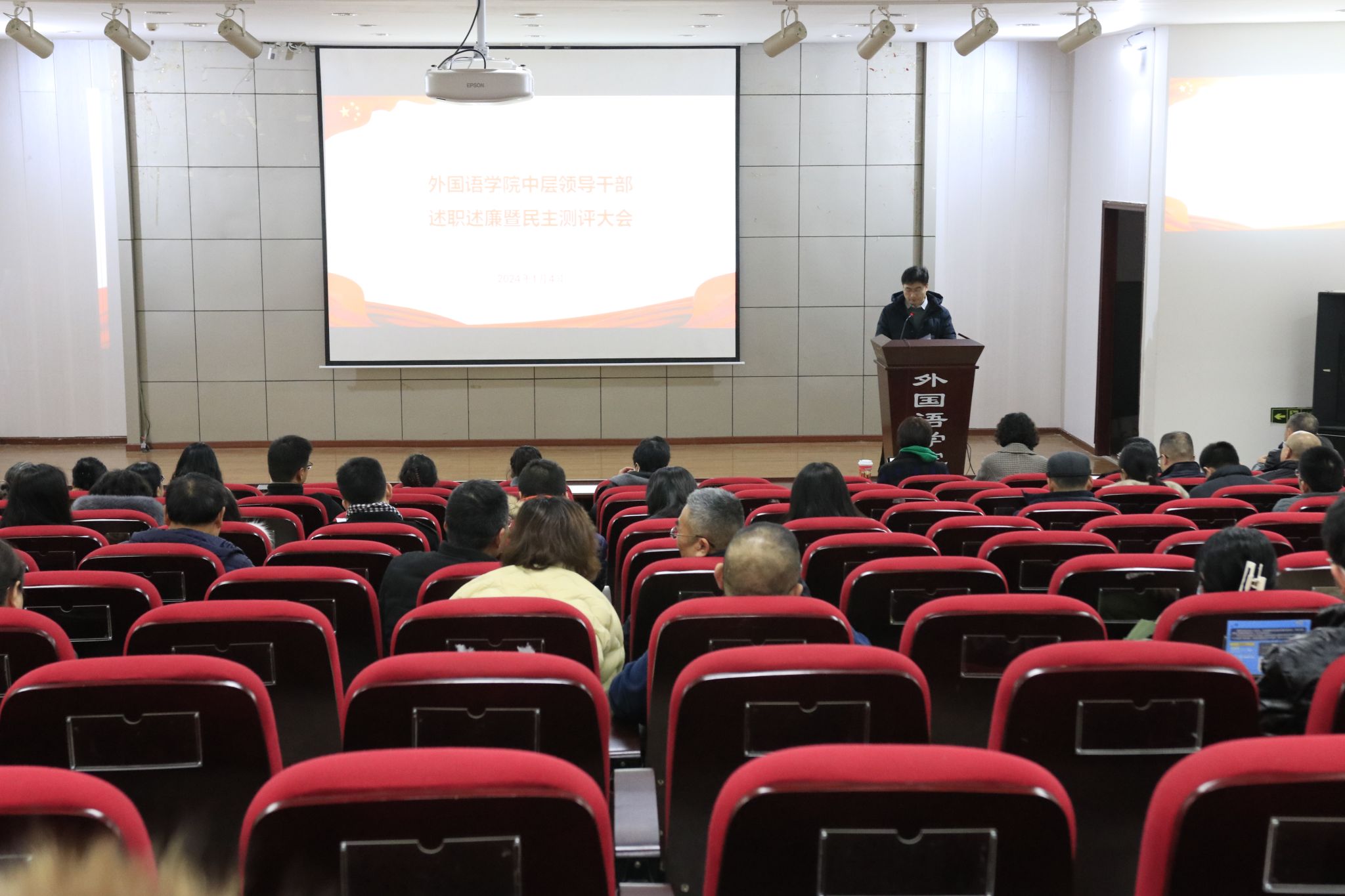 在外语学院楼二楼多功能厅召开了2023年度中层领导干部述职述廉暨民主测评会。学校考核组成员人事处副处长田辉、党委宣传部舆情干事何欢出席会议,色情影片
