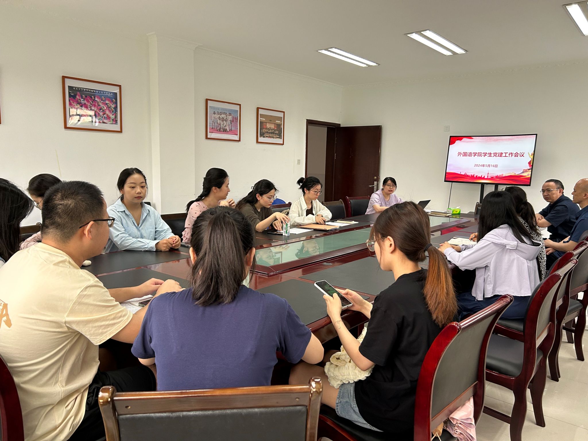 党委在外语学院楼416会议室召开了2024年第一次学生党建工作会议。会议由学院党委委员、组织员刘培老师主持,学院党委副书记、纪委书记魏世平老师,翻硕支部书记游振声老师,本科生支部书记张茹老师,辅导员张文静老师、周璐老师,各学生支部书记、支委委员参加了会议。