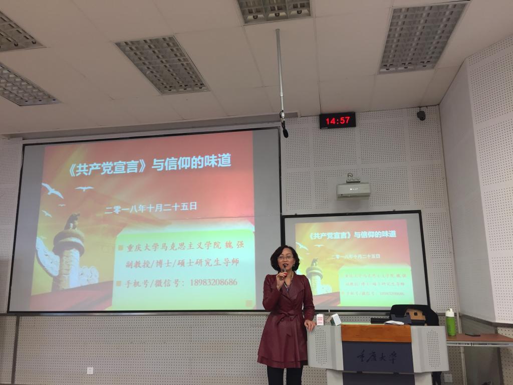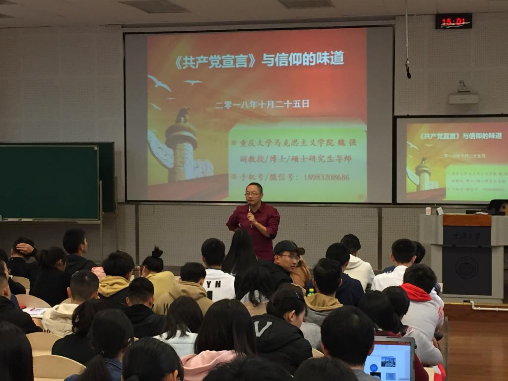 魏强老师首先介绍了1848年《共产党宣言》的发表标志着马克思主义诞生的伟大意义。随即,通过政论专题片《不忘初心 继续前进》片段,讲述了我国《共产党宣言》翻译第一人陈道望“真理的味道非常甜”的故事,勉励同学们追求真理,探索真理。魏强老师指出“中国共产党是《共产党宣言》精神的忠实捍卫者”,介绍了我国从粮票时代到改革开放的今天所取得的巨大成就,而这些都得益于中国共产党人把马克思主义原理和中国具体实际相结合的伟大创举。