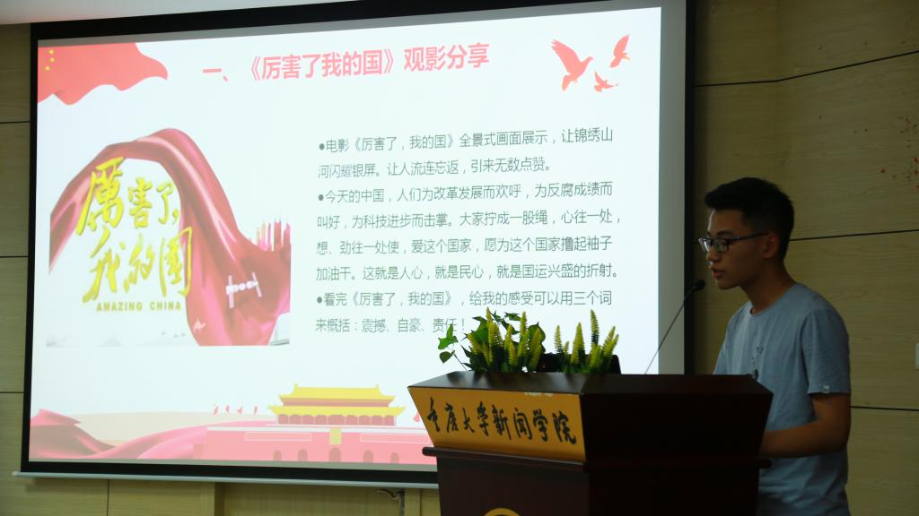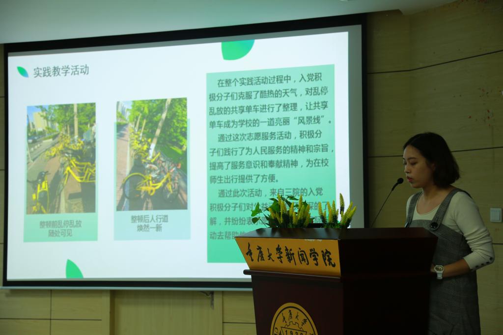 通过课堂教学“不忘初心,牢记使命,驾驭智能技术,创造美好生活”“聚焦党的十九大”以及“努力成为一名合格的大学生党员”的党课学习,同学们加深了对党的基本政策和属性的理解,并结合各自的专业特色和视角进行了解读。在第八组的成果汇报中,新闻学院学生以习近平的新闻思想为视角切入,阐释了习近平的新闻思想以及对新闻事业和新闻学子的要求;软件学院学生着眼于互联网的重要性,致力于加强自身专业能力,加快信息化服务普及,为老百姓提供用得上、用得起、用得好的信息服务;外语学院则对单词“PARTY”的各个字母通过今昔照片对比的方式进行思考和解读。