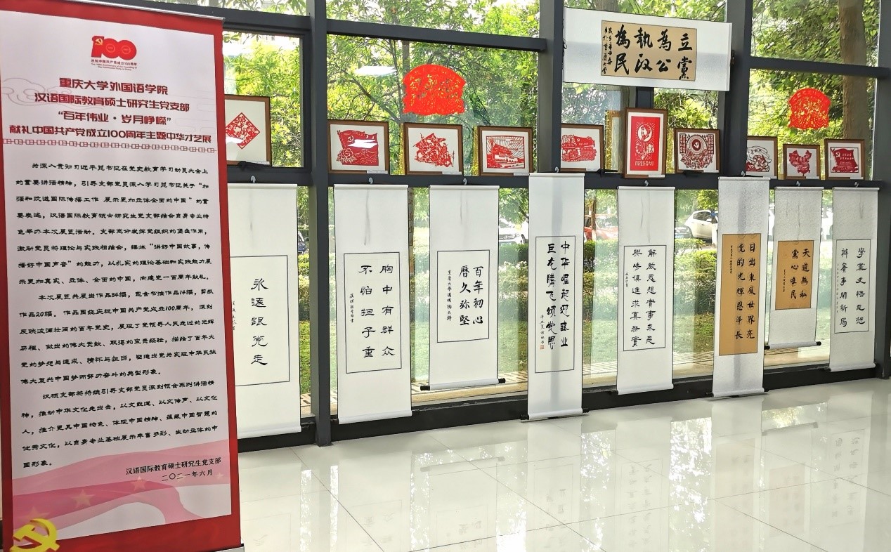 本次展览中,汉语国际教育硕士研究生党支部共展出作品34幅,包含书法作品14幅,剪纸作品20幅。作品围绕庆祝中国共产党成立100周年,深刻反映波澜壮阔的百年党史,展现了党领导人民走过的光辉历程、做出的伟大贡献、取得的宝贵经验,描绘了百年大党的梦想与追求、情怀与担当。本次活动中,支部充分发挥党组织的堡垒作用,激励党员将理论与实践相结合,锤炼“讲好中国故事,传播好中国声音”的能力,以扎实的理论基础和实践能力展示更加真实、立体、全面的中国,献礼建党100周年。