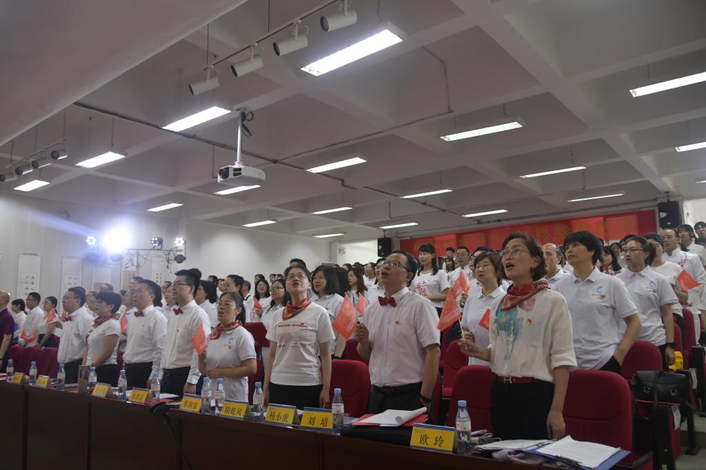 在活动的最后,党委书记欧玲带领全体党员一起重温入党誓词,大家齐唱《我和我的祖国》。活动在浓厚热烈的氛围中结束,在场的师生党员情绪高涨、意犹未尽。学院党委书记欧玲做了总结发言,高度评价了各支部的精彩表演,要求全体师生党员在“两个一百年”奋斗目标的历史节点,要“撸起袖子加油干”,教师党员要认真落实立德树人根本任务,学生党员深入领会习近平总书记对青年立大志、明大德、成大才、担大任的要求,让青春在奋斗中绽放绚丽之花,以优异成绩迎接建党100周年。