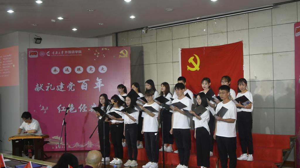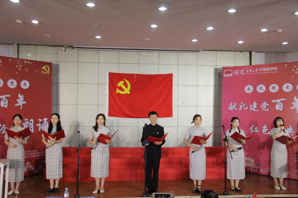 楼二楼多功能厅举行了“永远跟党走——献礼建党百年,红色经典诵读”活动。全院近200名师生党员用中英日德法俄六语种朗诵了《共产党宣言》、《长征》、《习近平谈治国理政》等作品。