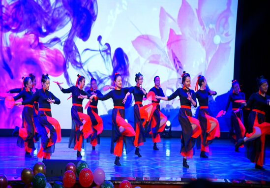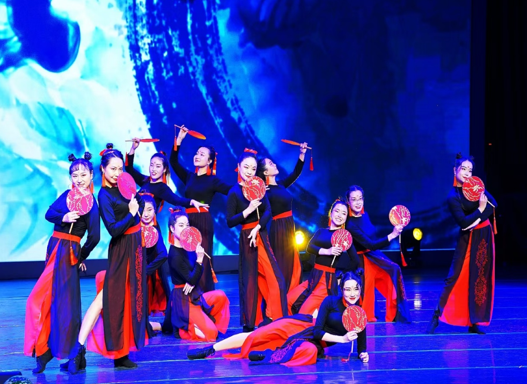 在群舞演员黑色剪影中,追光灯底下,吴娟老师的开场亮相动作即获得满堂喝彩。惊鸿一瞥中,富有节奏感的古风乐曲《芒种》以古筝和琵琶的悠扬旋律将观众们带入了红色与黑色交织的情境中。红色印金花团扇精致素雅,黑色高耸发髻配红色丝带衬托出女老师们的巾帼英姿,黑红相间的舞裙蹁跹中,散发出女性特有的飘逸柔美。12名教师舞蹈演员手拿团扇翩翩起舞,时而犹抱琵琶半遮面,时而意气风发凭恣意,老师们如花般的笑靥更为节目增添一抹亮色,博得了全场阵阵掌声及喝彩声。