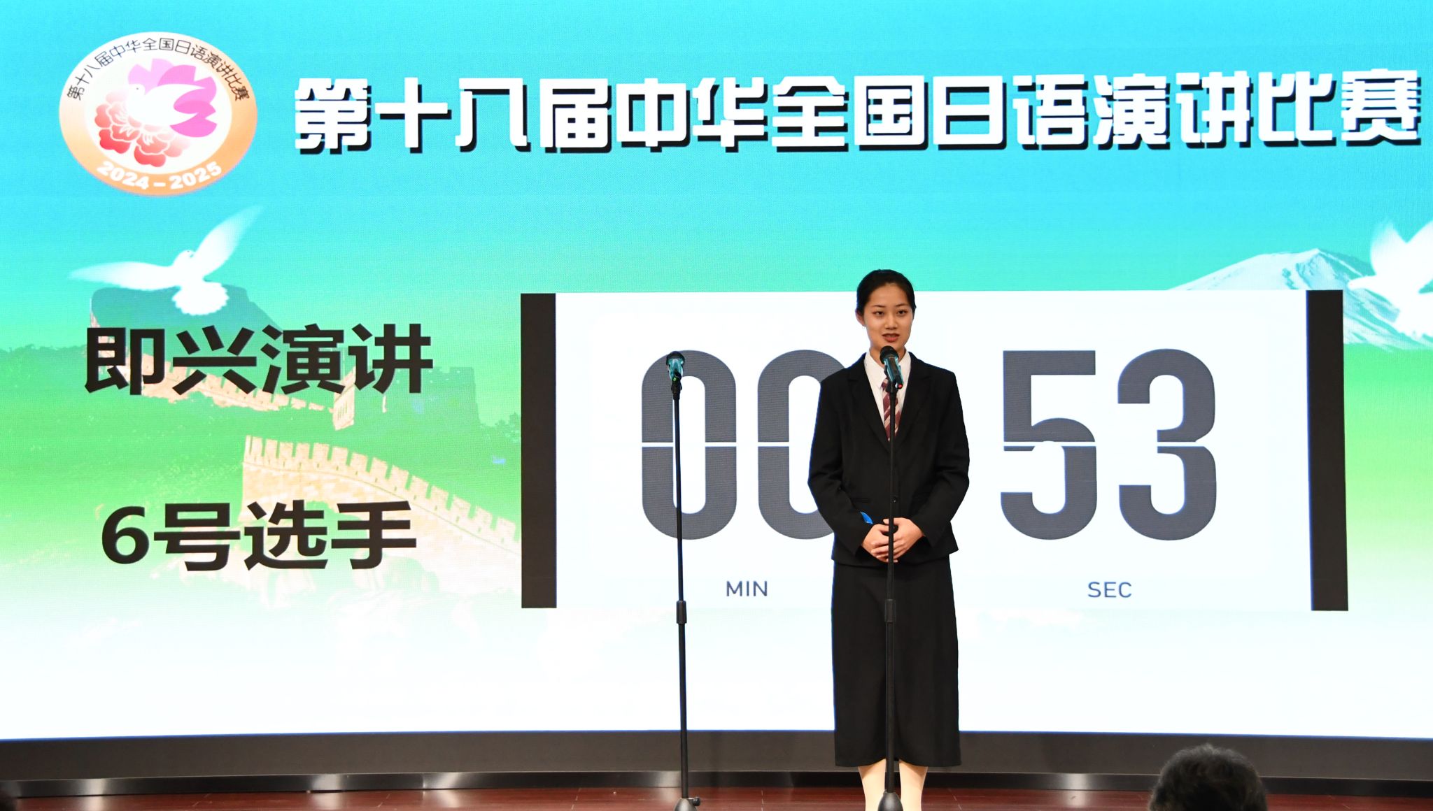 比赛分为命题演讲和即兴演讲两个环节,命题演讲题目为“建设和平与包容的世界——青年何为”以及“假如我坐拥百万粉丝”,选手们需在5分钟内围绕主题深入阐述自己的见解与思考。而即兴演讲环节,则要求选手上台后当场抽签作答,这对选手的应变能力、思考能力、临场心理素质以及语言表达能力提出了极高要求。我校选手吴笑恬凭借独到深刻的主题阐述、优美流畅的语言表达以及镇静出色的临场发挥,在一众实力强劲、高手如云的参赛选手中,以第二名的成绩脱颖而出,揽获大奖。