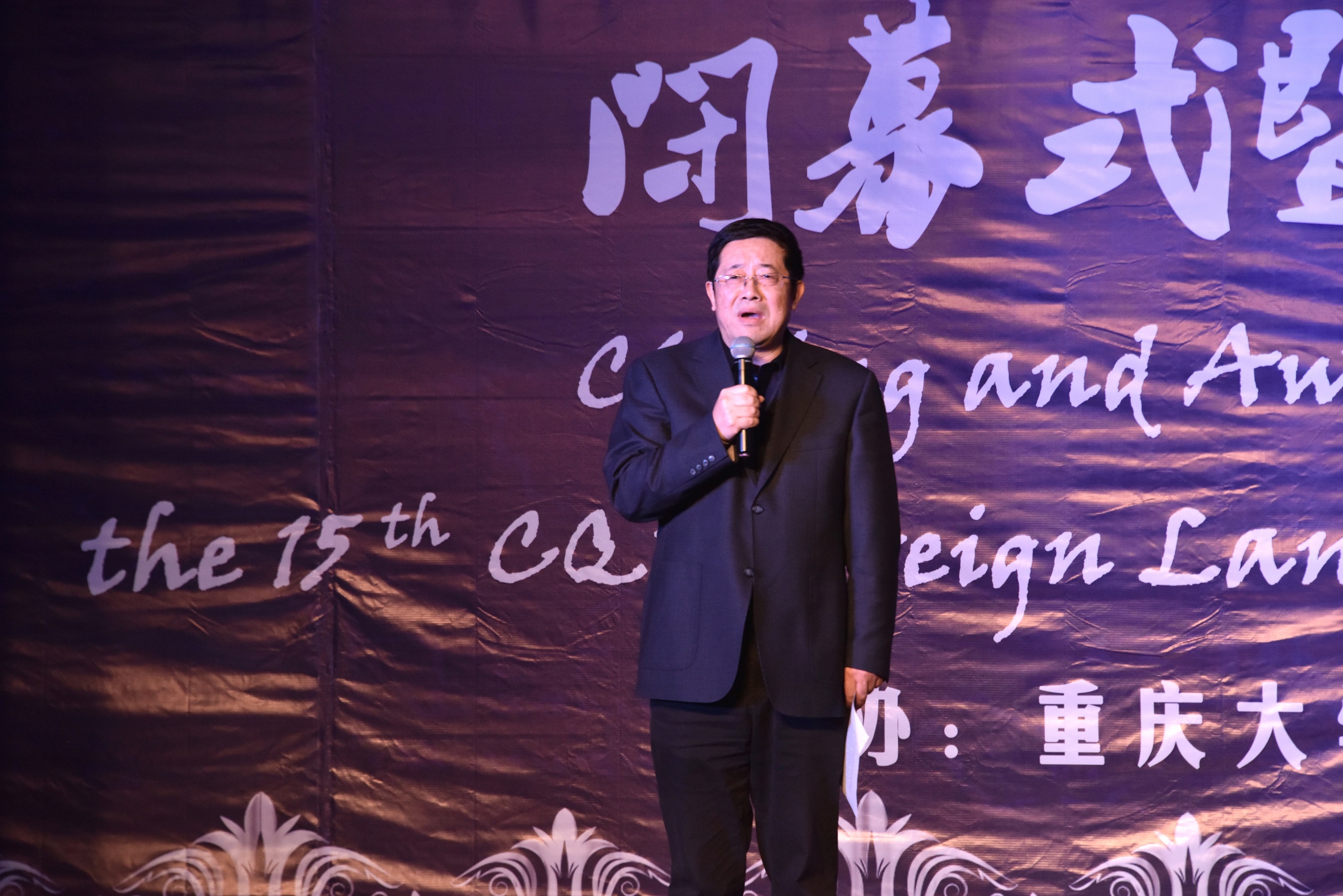 国际处科长刘郢老师;虎溪校区党工委副书记出席、学工办主任王宇红老师;沙坪坝区烟草专卖局副局长江山先生;重庆服务贸易协会研究咨询部部长唐笑水女士;新东方重庆总部国外考试部招聘主管雷婧女士,以及外院全体同学应邀参加晚会。