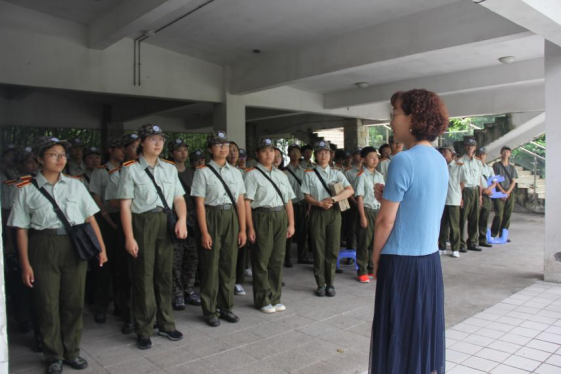 欧书记发表简短讲话。她首先传达了对这一届新生们的亲切问候,从同学们感触最深的军训说起,以风趣幽默的语言拉近了与同学们之间的距离,让原本紧张的新生们放松下来,现场氛围也变得更加轻松活跃。随后她切入同学们关注的话题,针对新生们的学习生活提出了一些可行的建议。她说,军训期间,希望大家在高强度的军训过程中也要注重自身身体状况和心理状况,尽快适应校园环境;同时也希望在度过高考后一段空窗期的新生们,面对即将到来的大学学习,尽快收心和恢复学习状态。最后,欧书记表达了对2021级新生军训生活的真挚祝愿,希望大家珍惜这段宝贵的经历,并在其中收获友谊和磨砺意志。