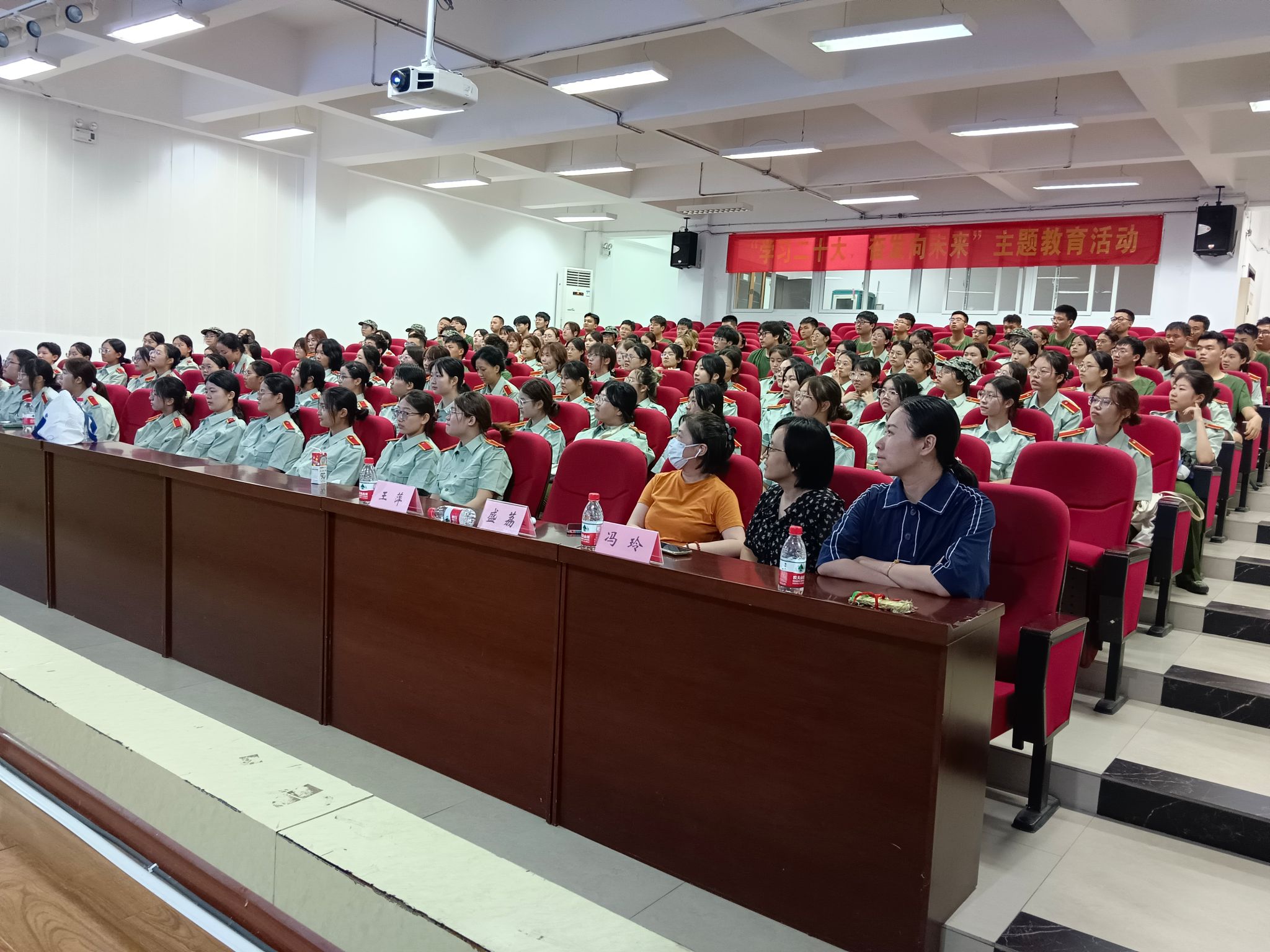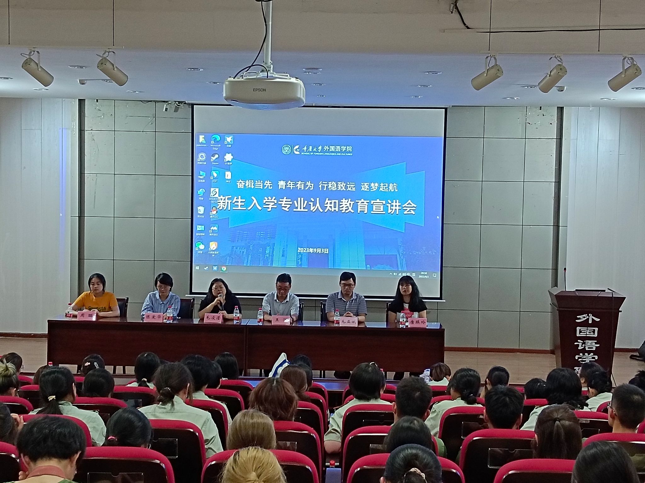 召开了2023级本科新生入学专业认知教育宣讲会,全体新生着军训服,整齐划一就座。参加此次会议的有英语系系主任毛凌滢教授,副系主任盛荔副教授,日语系系主任陈爱华教授,德语系系主任毛亚斌教授,以及教务办和新生辅导员老师。副院长王江教授主持了此次宣讲会。