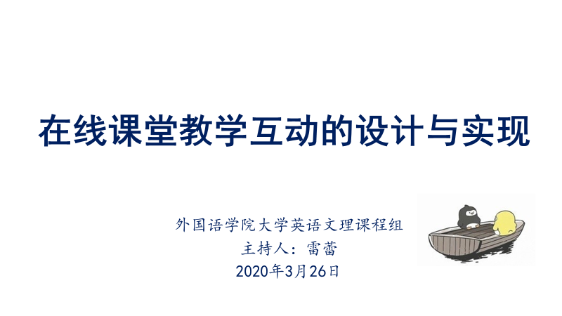 本次公开教研活动的主题为“在线课堂教学互动的设计与实现”,议程有三项:一、课程组教师互动设计分享;二、课程主任总结互动的利弊及设计原则;三、教学专家点评及指导。