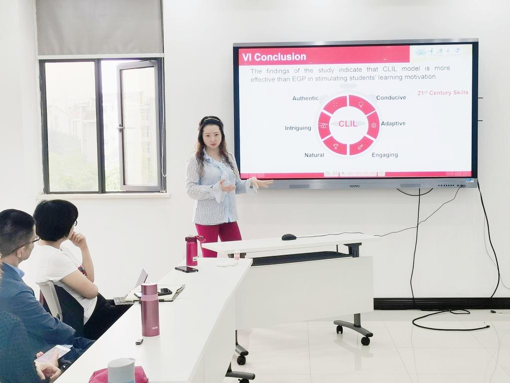 方玲老师与参会教师分享了她的课程教学改革研究“大学英语CLIL教学模式对建筑类学生英语学习动机的影响”。该研究通过课堂观察、教学日志、测试、问卷调查及访谈等定性与定量相结合的实证研究方法,历时三年,以179位建筑类专业大学生为样本,来研究和分析CLIL(学科内容与语言相结合的)教学模式(content and language integrated learning)在大学英语教学中的可行性,以及该模式对学生学习动机的影响,同时为语言老师在该模式下的角色整合及定位,提供参考建议。